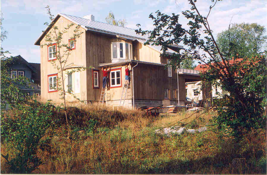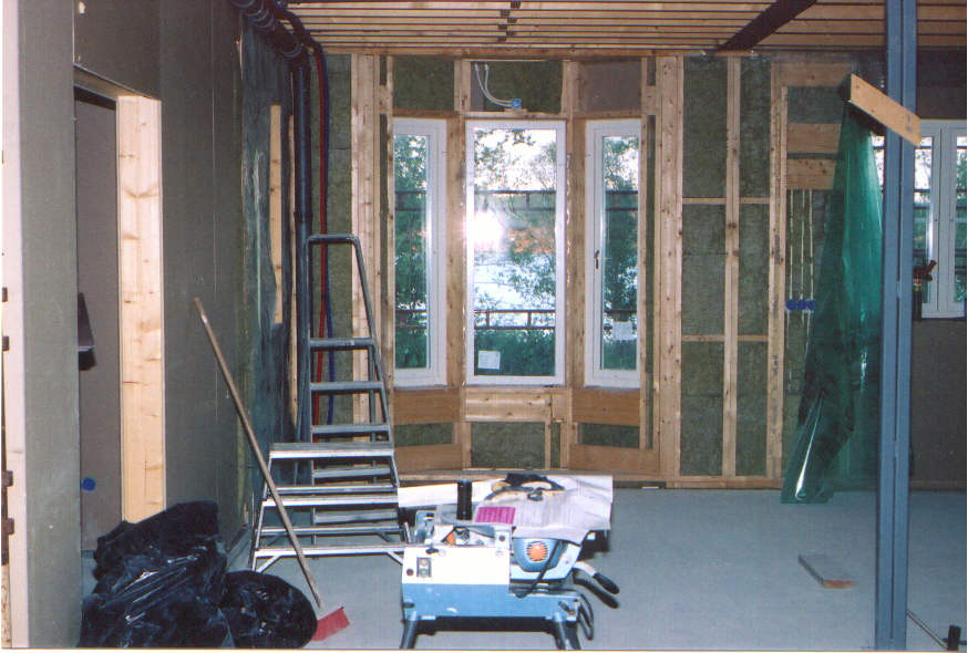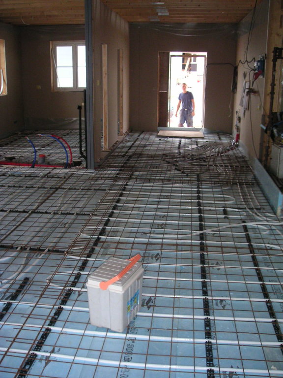 Innergolvet armerat och redo för gjutning. Till höger kabelgraven för värme, el, tele etc.