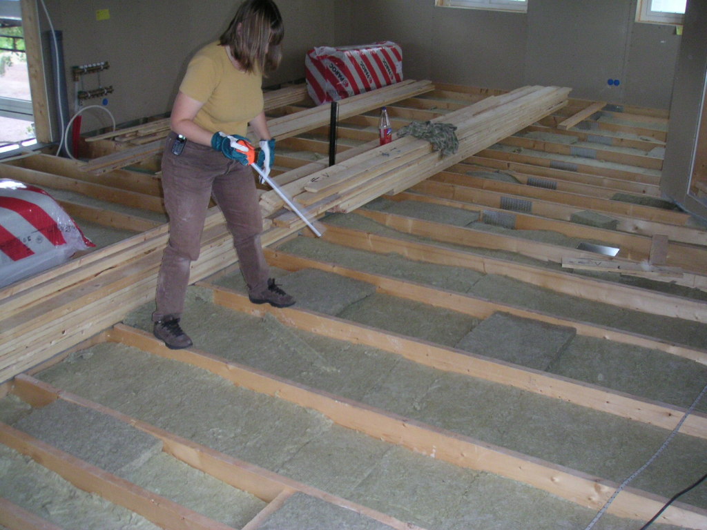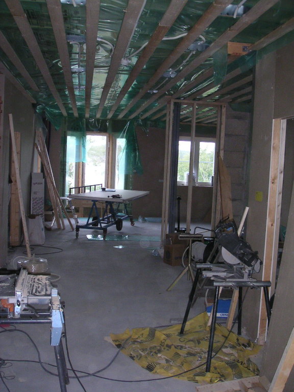 Josephine vacuums before 100mm of mineral wool is put in the roof for soundprooofing.