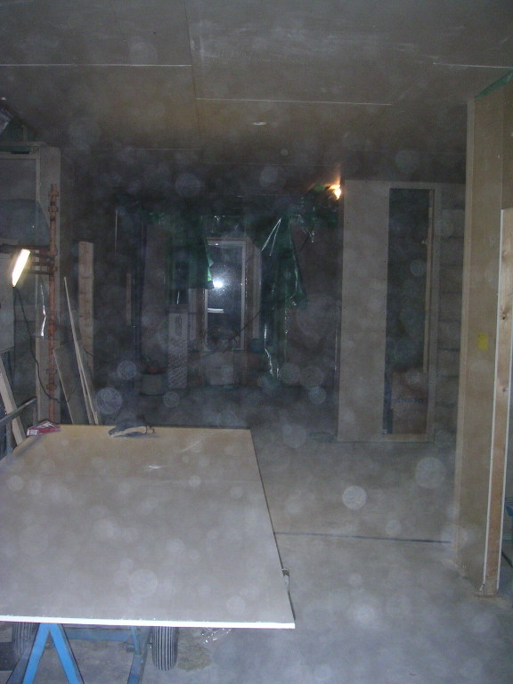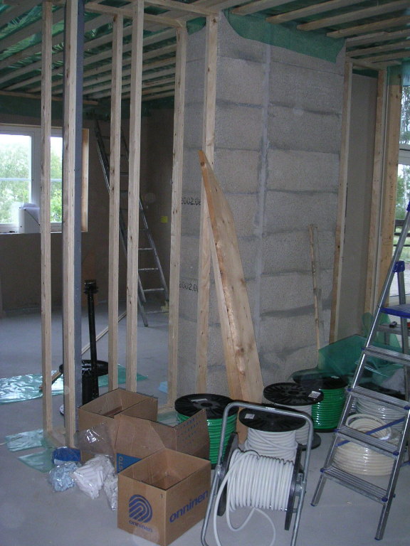 Mellanväggar börjar ta form. Till vänster väggen vid spismuren som skall inrymma en smal bokhylla. Till höger ser du en vy från hallen mot matsalen.