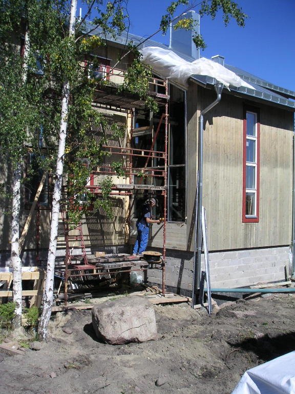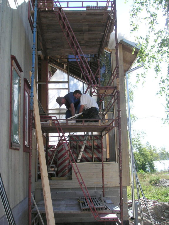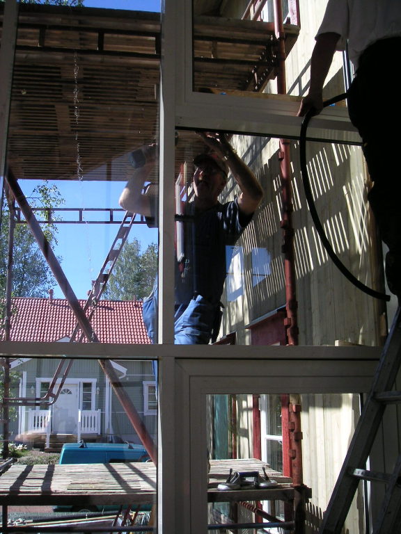 Glasväggarna kommer äntligen på plats. Profilerna kommer från Sapa och monteras upp av Holmbergs.
