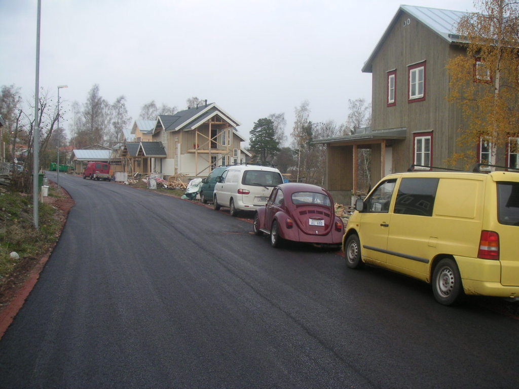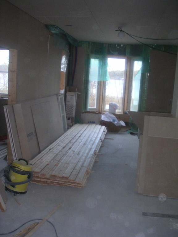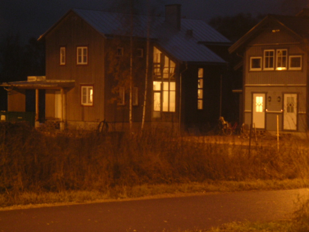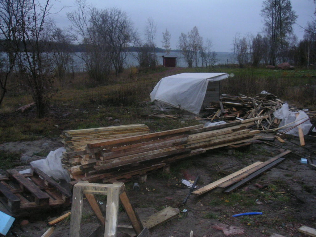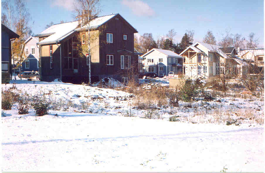 Första snön föll 2003-10-25, just som byggarna fått formarna klara för att gjuta trappor och fundament till stödmur. De flesta innerväggar och tak är på plats och ditskruvade av undertecknad. Det har gått åt n-å-g-r-a lådor gipsskruv ;)