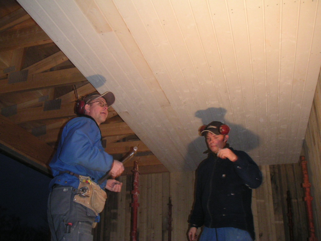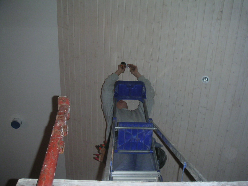 Elektrikern sätter in spottar i snedtakets pärlspont. Detalj av spotligt till höger.