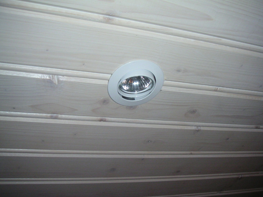Spotlights are put in place. To the right a close up of one spot (out of six) and the stained wood ceiling.