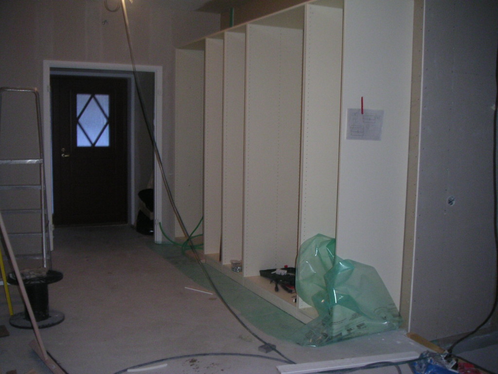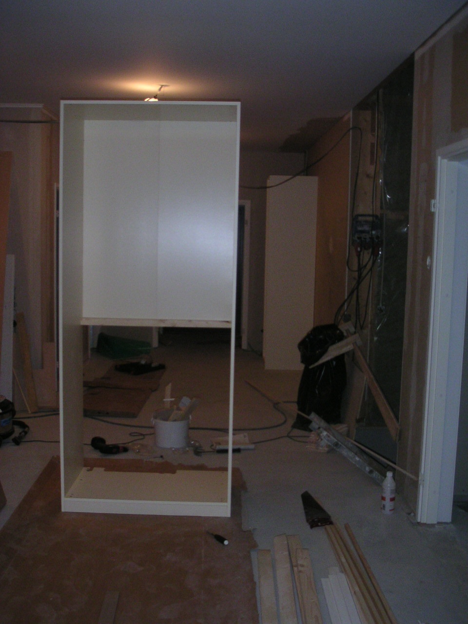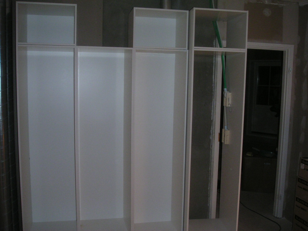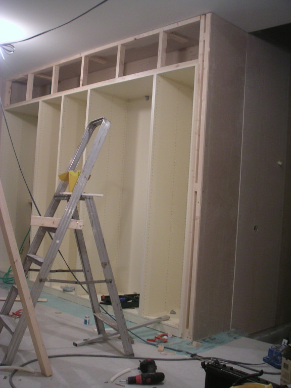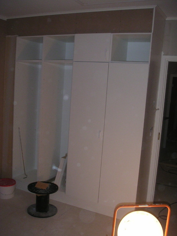 Hall-wardrobes. IKEA Pax 2360mm high. Two 1000mm wide and three 500mm wide. Will be built into the wall. The leftmost wardrobe has a cutout for the junction-box for the floor heating.