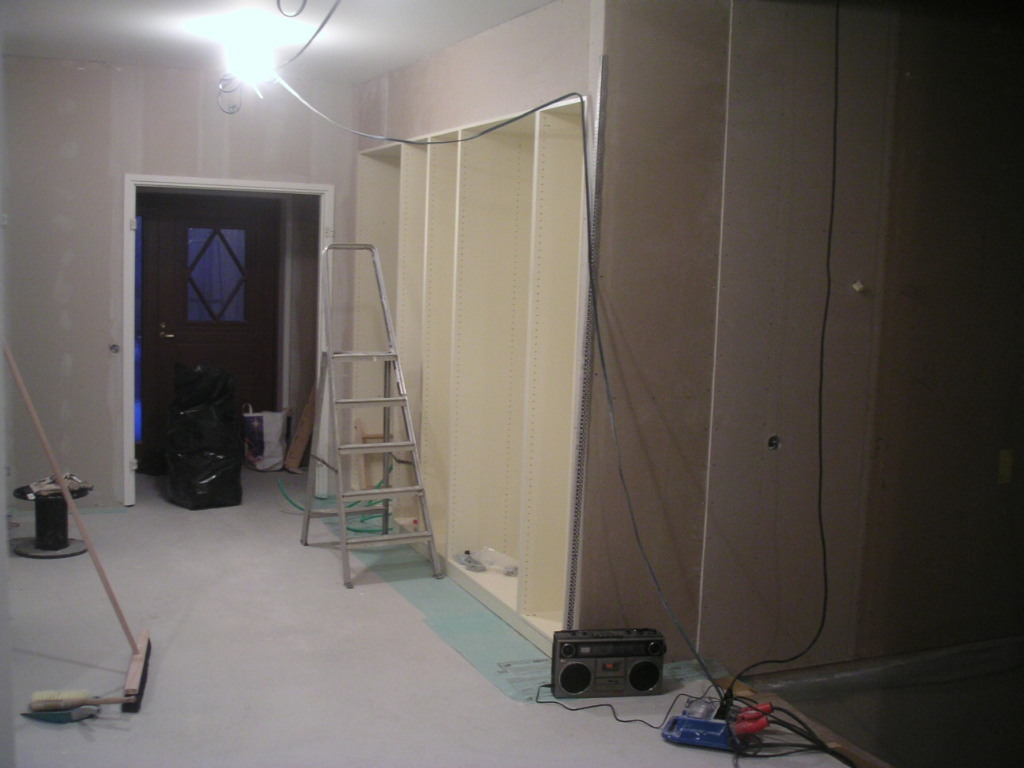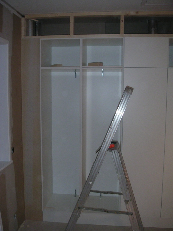 Hallskåpen monteras. IKEA Pax, 2360mm höga. Även de skall byggas in i väggen. En garderob har urtag för fördelaren för golvvärmen som sitter på väggen.