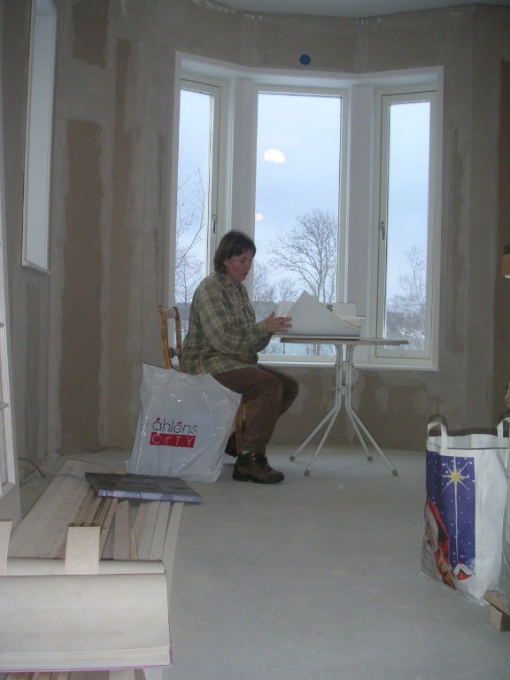 Trappan lackas. Passar bra då det lackar mot jul. Tre lager parkettlack med slipning mellan. Sista lagret lack läggs på då trappan monterats.