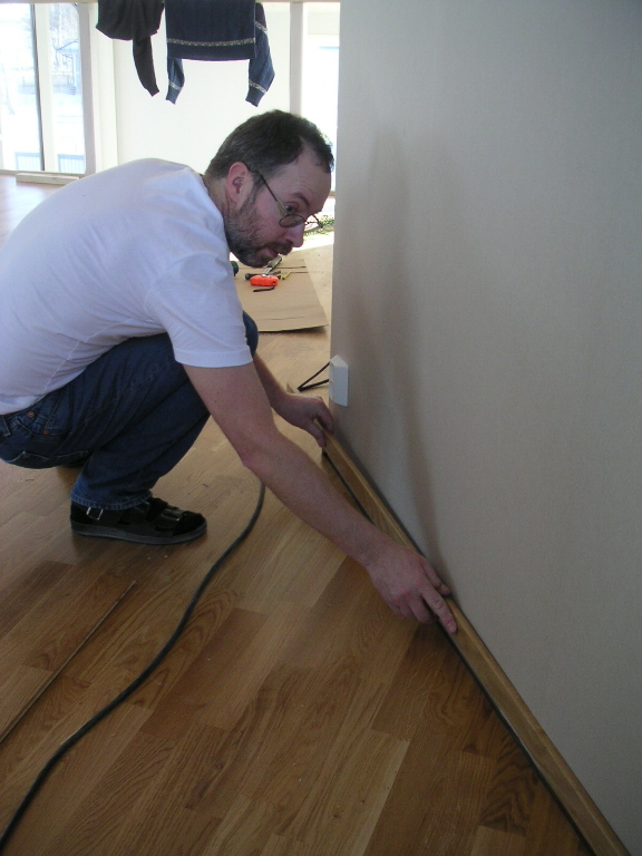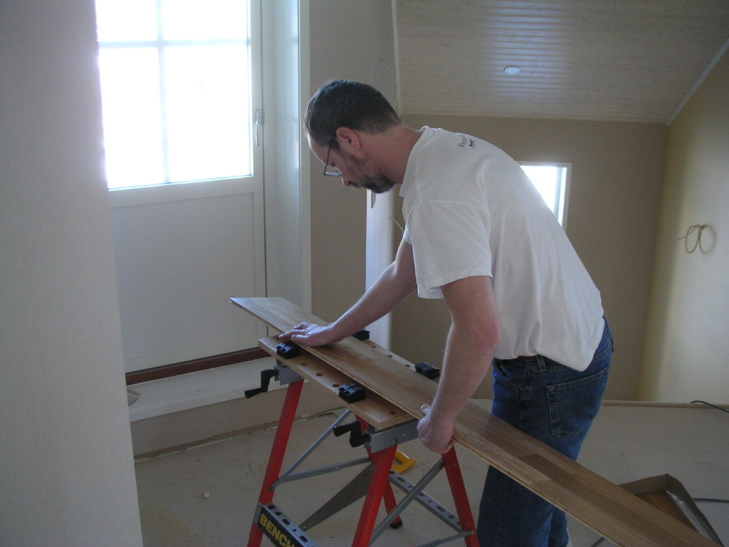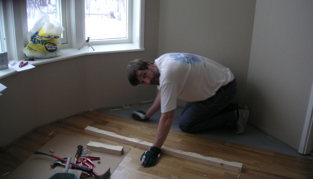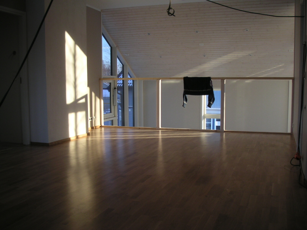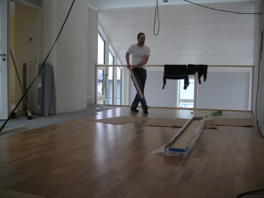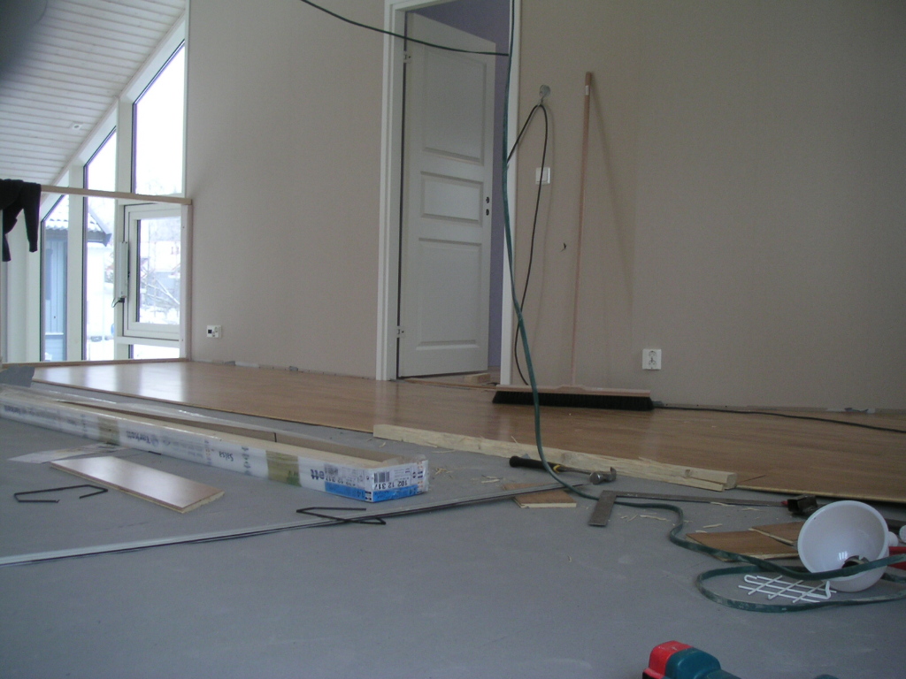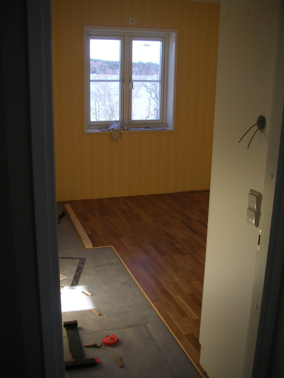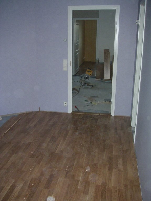 Anni's room with parquet being laid. It took about one day to get as far as the picture above right. Parquet is "click-type" no glue, but loads of elbow-grease.