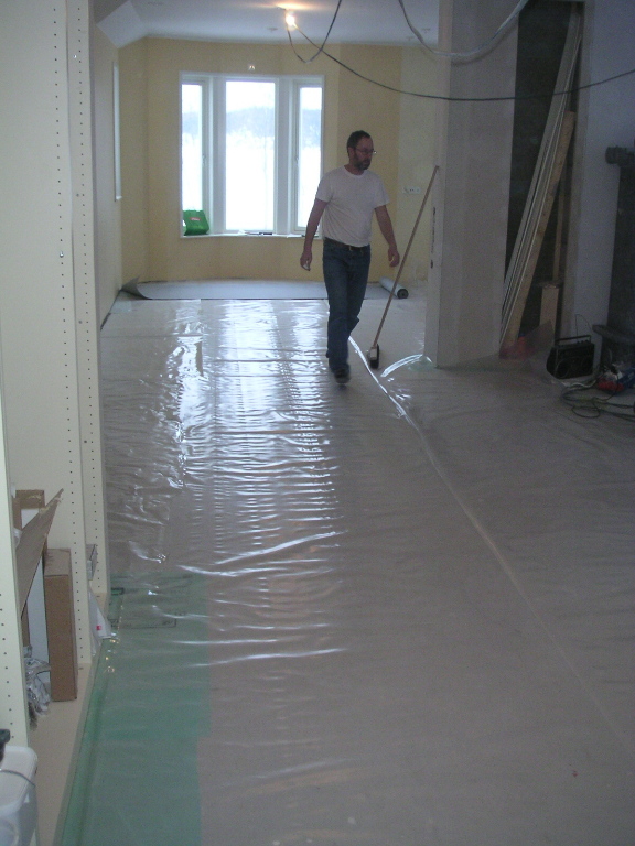 Sedan lägger man på plastfilm som fuktspärr och sist lump-papp som stegdämpare. Ovan ser du Johan skynda fram över det plastade matsalsgolvet. Första varvet lumppapp skymtar i bakgrunden.