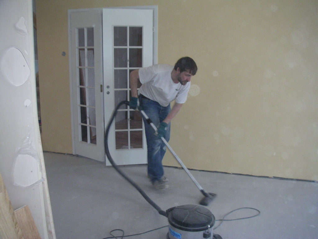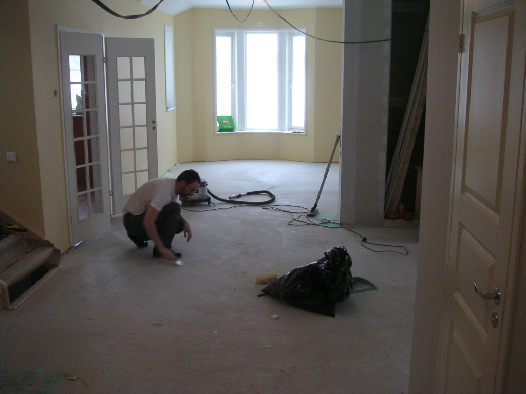 Det är en del som skall göras före man kan lägga parkett. Först skrapar man bort spilld spackel och liknande, samt putsar bort ev gjutskägg i kanterna. Sedan sopar man och dammsuger tills det är absolut rent..