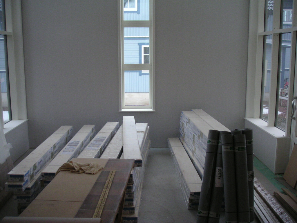 Gästrummet med parkett och lister på plats. Det stora paketet är en av dörrarna till hallgarderoberna.