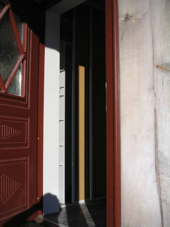 På bilden till höger ser du in i vindfånget. Skjutdörrarna skymtar och bakom dem trådbackar och klädhängare.