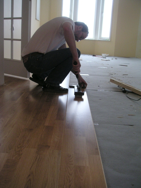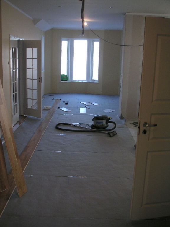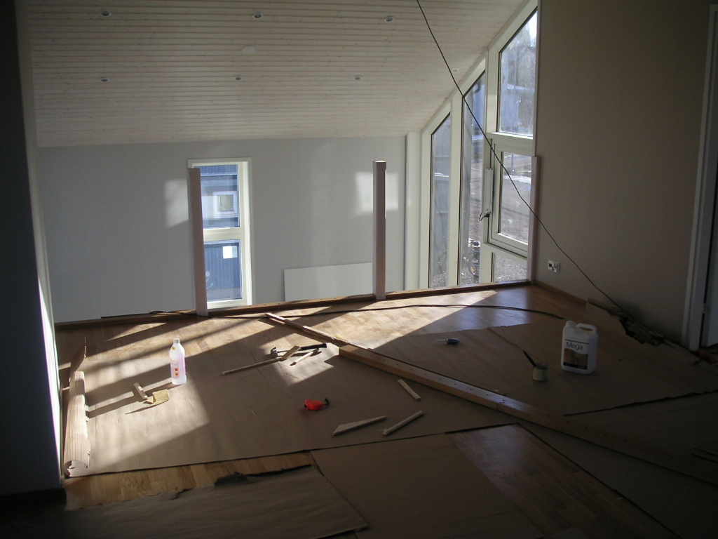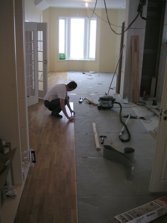 Började lägga parkett i hall/matsal. Totalt 12 meter och till råga på eländet är inte norra väggen rak utan i avsatser.