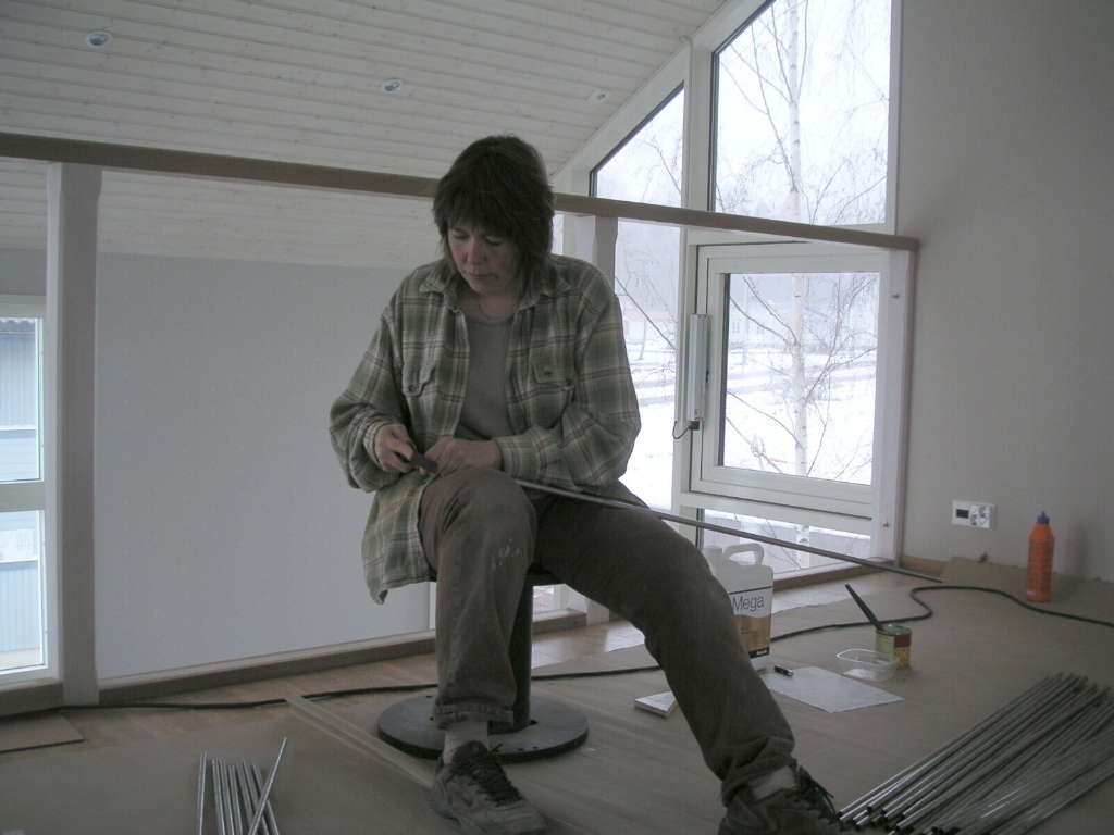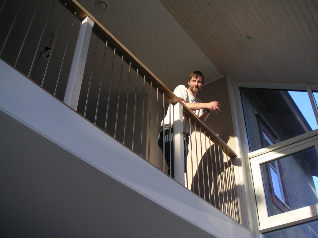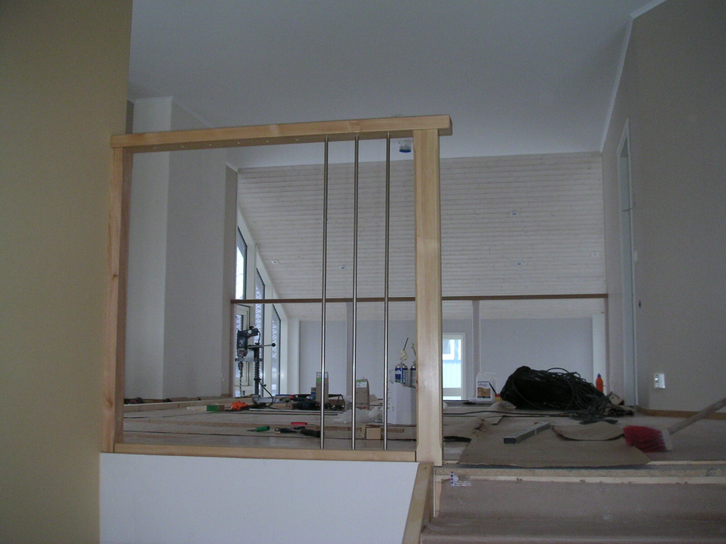 Började bygga räcken i övre våningen. Trappräckena är lackad furu. Det södra räcket är ek, med stolpar i laserad furu. Stängerna är 12mm borstat rostfritt rör.