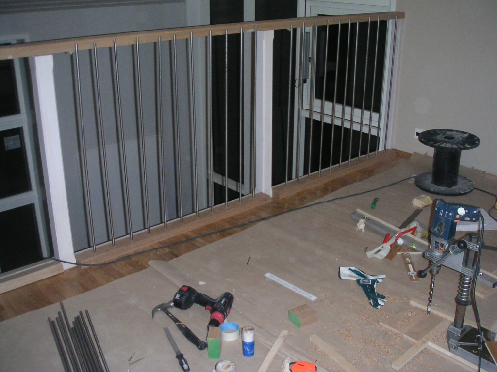Started assembling the upstairs railings. The railings by the stairs is varnished fir. The south-side railing is oak and stained fir, plus brushed stainless