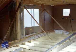 Övre våningen, riktning sydost (vänster) samt nordväst med sovrummet (höger).