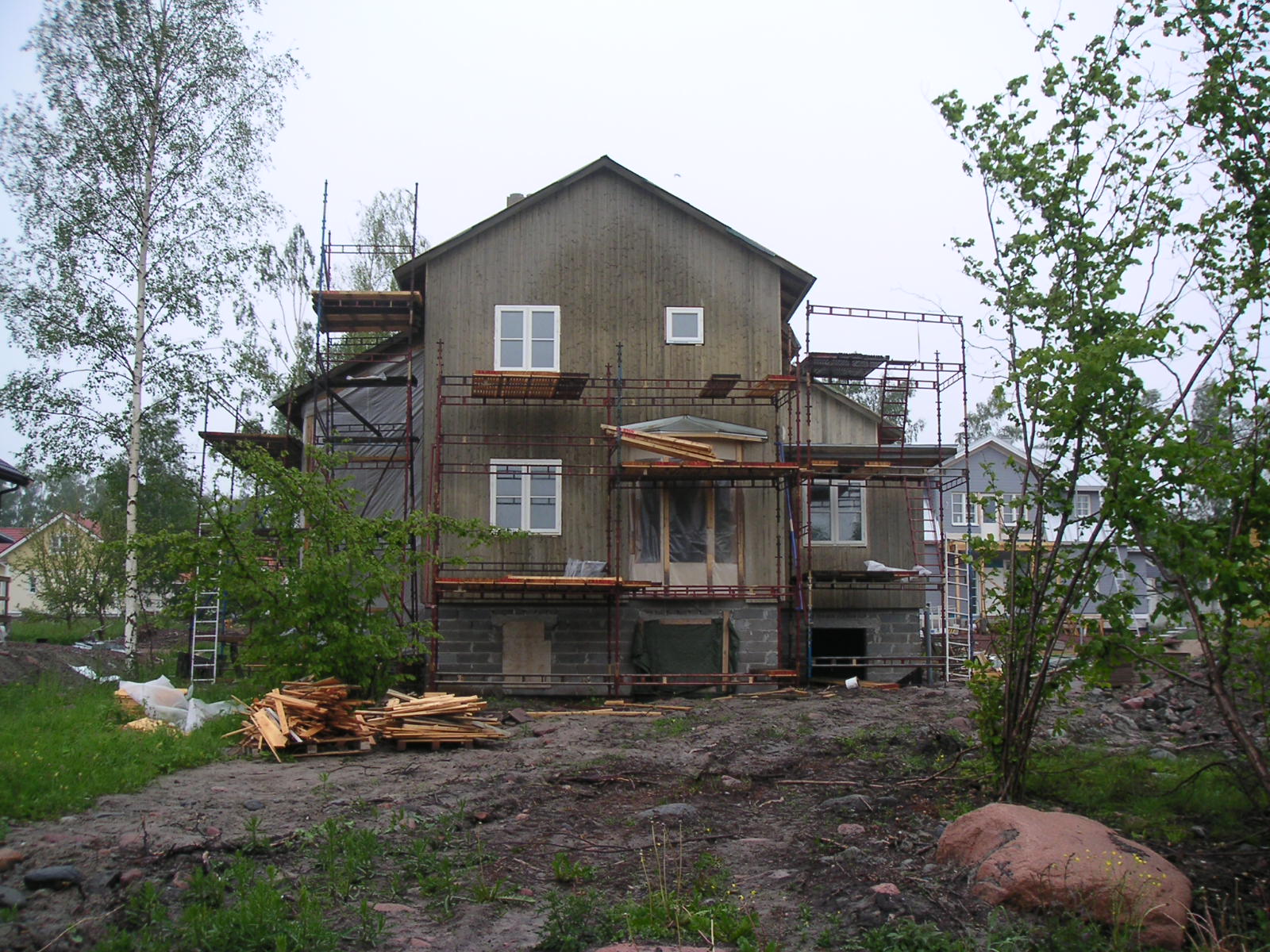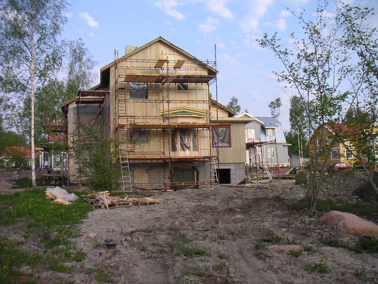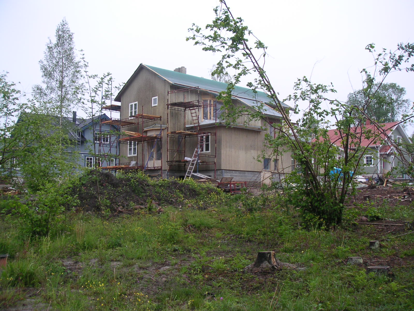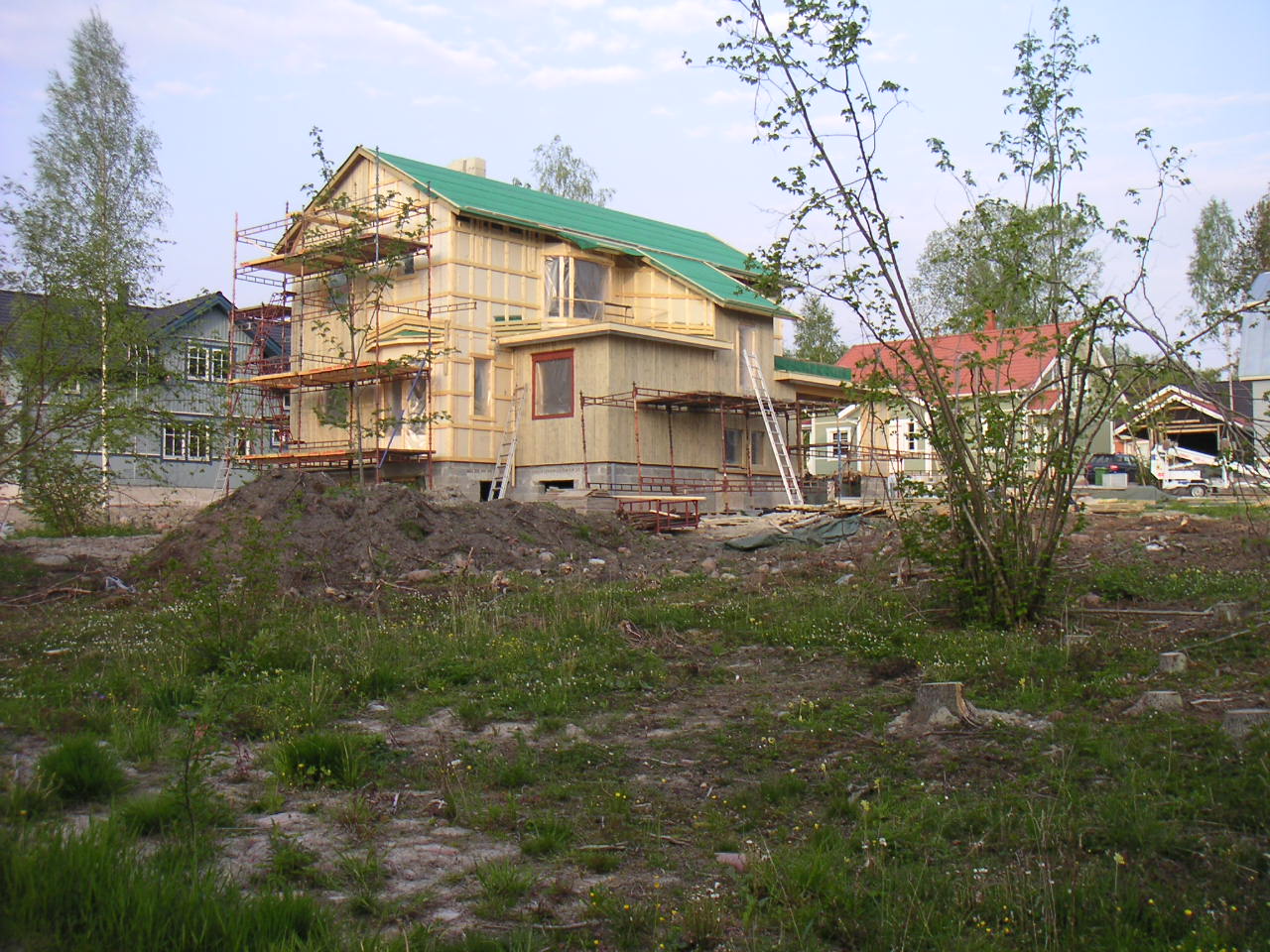Huset i morgonsol, 06:30 en morgon i början av juni. Foderbräder kring biblioteksfönstret är för att prova ut mått och färg.
