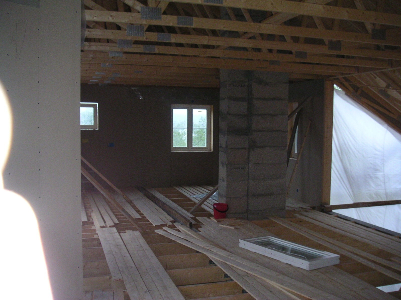 Vy över det aningen glesa golvet i övrevåningen. Vi får hyfsat breda fönstersmygar att ställa våra blommor på.