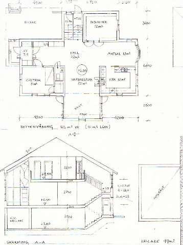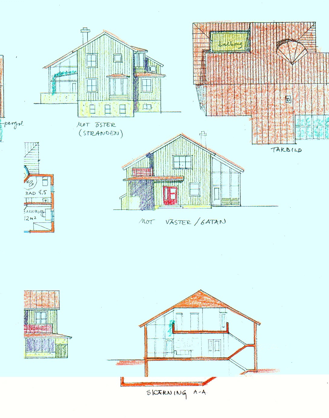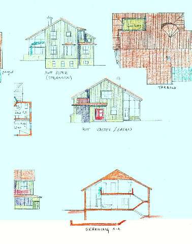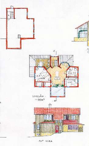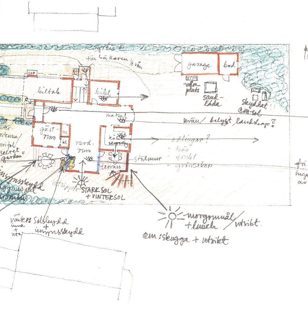 Kanske inte Feng-Shui, men det är mycket viktigt hur tomten ligger och hur man utnyttjar ljuset då man bygger hus. På bilden nedan ser du hur Gunda hade tänkt sig att man skulle utnyttja dagsljus och utsikten. Vi hade redan i planeringsskedet sagt att vi ville ha ljus och rymd.