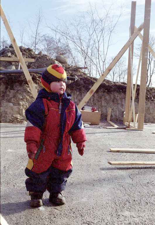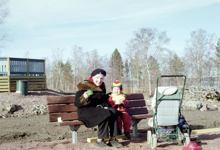 Cellar half-done and Grandma Ulla and Anni on the playground with construction site in the background.